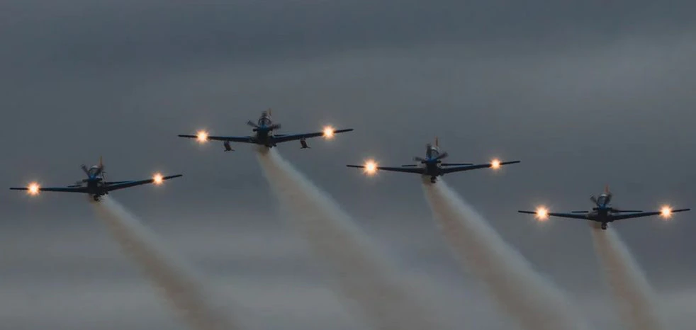 Con sus coloridos aviones, los pilotos ofrecieron un repertorio de vuelos en formación de a cuatro aviones, acrobacias y bocanadas de humo. Junto con esas aeronaves vino un Embraer KC-390, un avión táctico de transporte y reabastecimiento, para la que Fadea ha fabricado componentes.